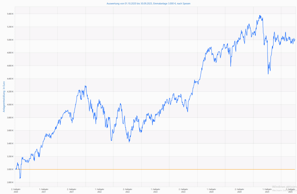 Bei der Einmalanlage: Kapitaleinsatz: 3.000 EUR; Wert am 30.09.2025: 5.009 EUR.
