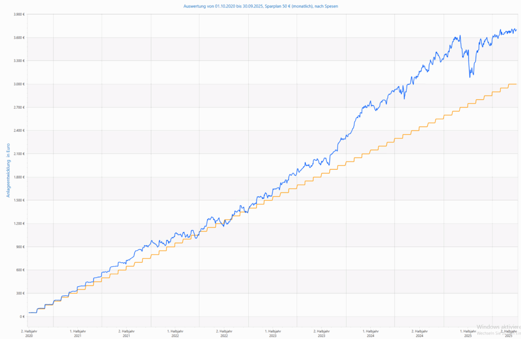 Beim Sparplan Kapitaleinsatz: EUR 3.000; Wert 30.09.2025: 3.707 EUR.